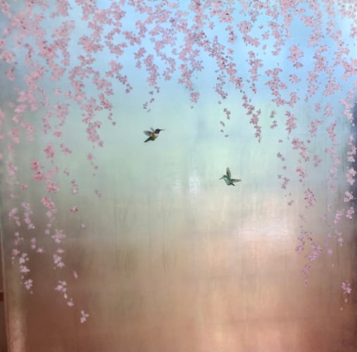The physical process begins with coating and sanding the canvas until it becomes a silky surface. Then she smooths on a traditional red paint, lays the gold or silver leaf, and coat it with layers of varnish.